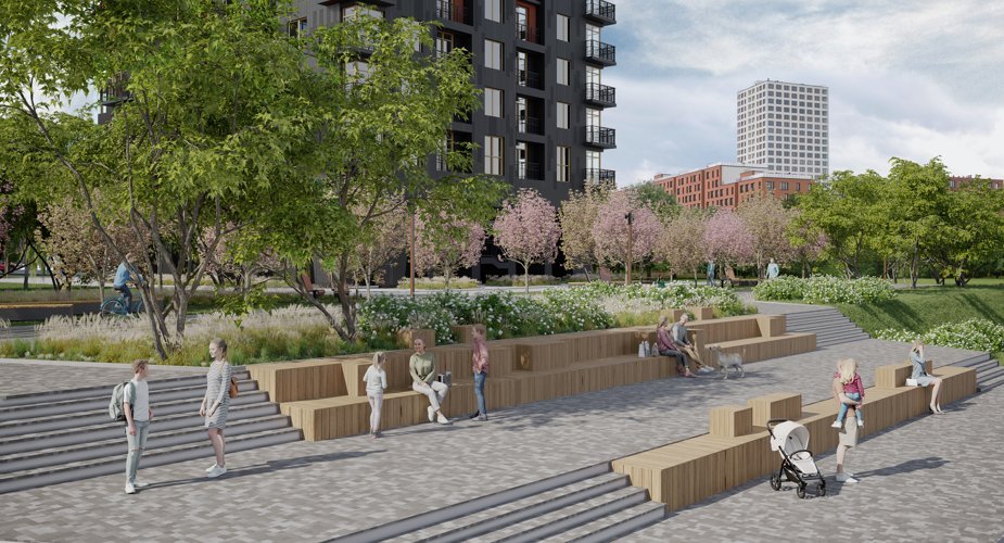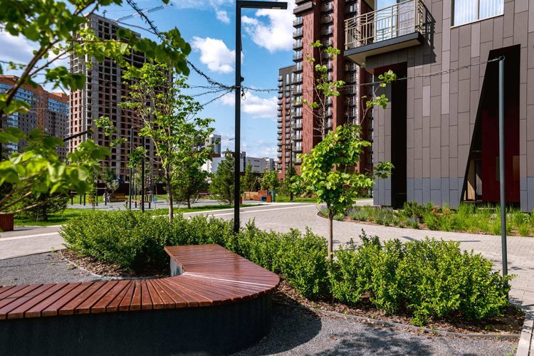 Благоустроенные дворы под видеонаблюдением, пешеходные зоны и прогулочная набережная у дома