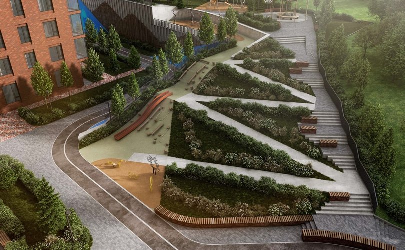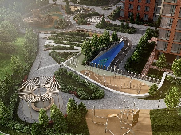 Во дворе предусмотрены шахматное поле, тематическая детская дорога и даже кафе с террасой. Каждое пространство продумано, чтобы отдых был разнообразным и интересным