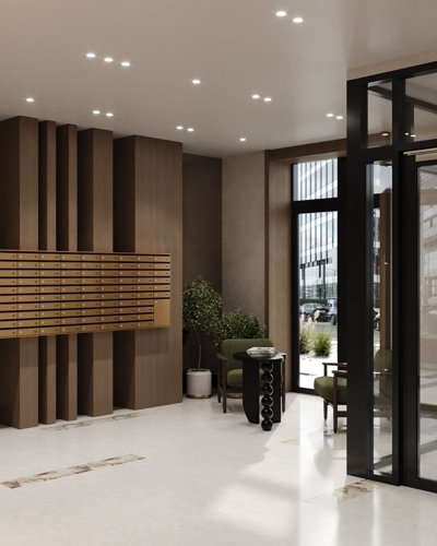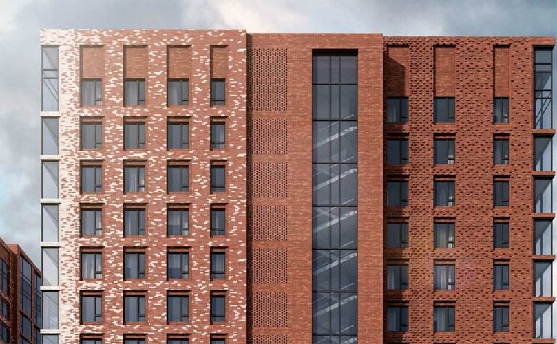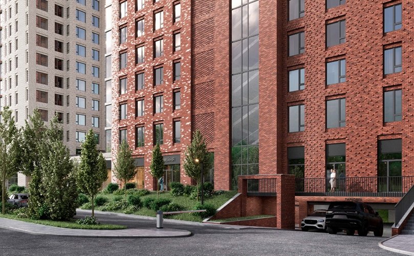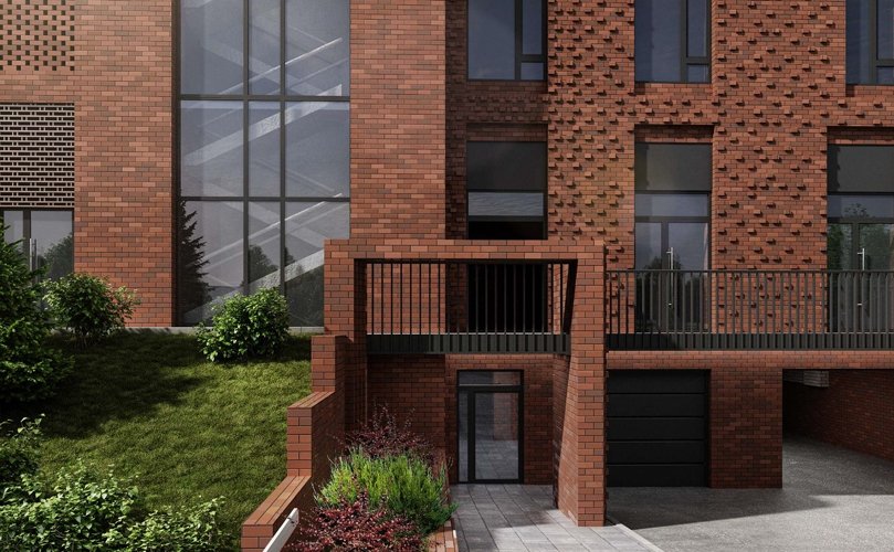 Фасады выполнены в уникальной градиентной кирпичной кладке, которая смотрится свежо и эффектно, не похоже на остальные дома района. Панорамные входные группы добавляют света и простора, формируя ощущение статуса уже с порога