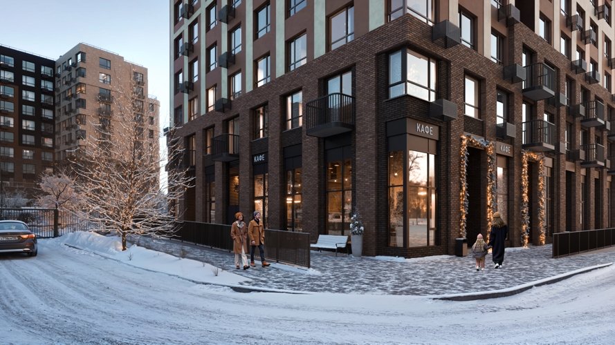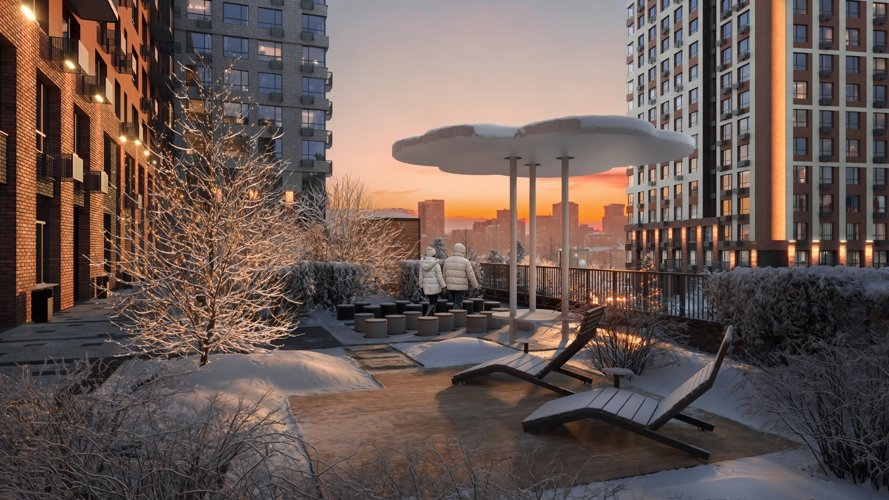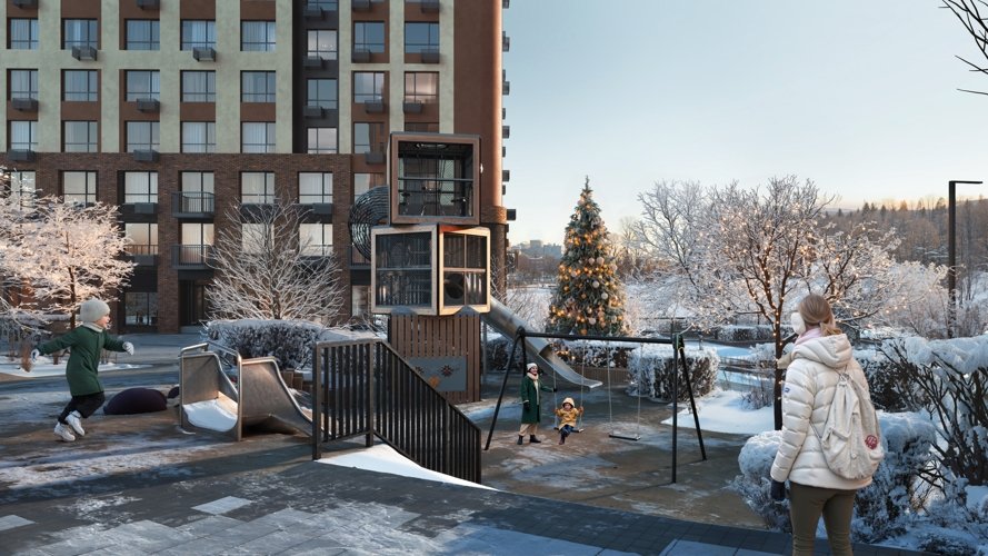 В малоэтажном корпусе двор рассчитан на тихий отдых и уединение. Во дворе высотки - современные детские площадки и лаунж-зоны для встреч и общения
