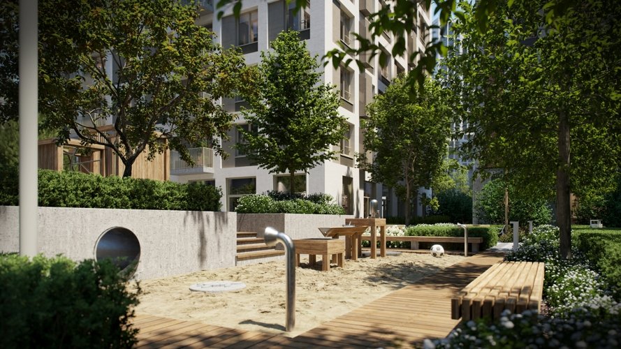 Внутренняя территория комплекса спроектирована так, чтобы в одном пространстве могли сосуществовать тишина и активность. Есть игровые зоны для детей разных возрастов, спортивные площадки, маршруты для прогулок и уютные места для отдыха. Благоустройство вдохновлено природными мотивами: водные элементы, зелёные островки и комфортные площадки создают ощущение живого дышащего пространства
