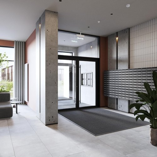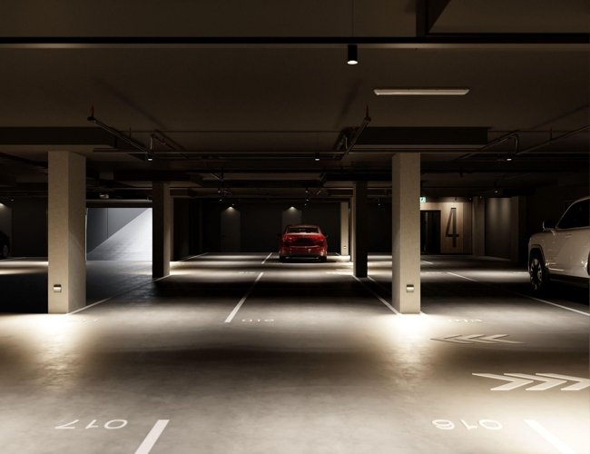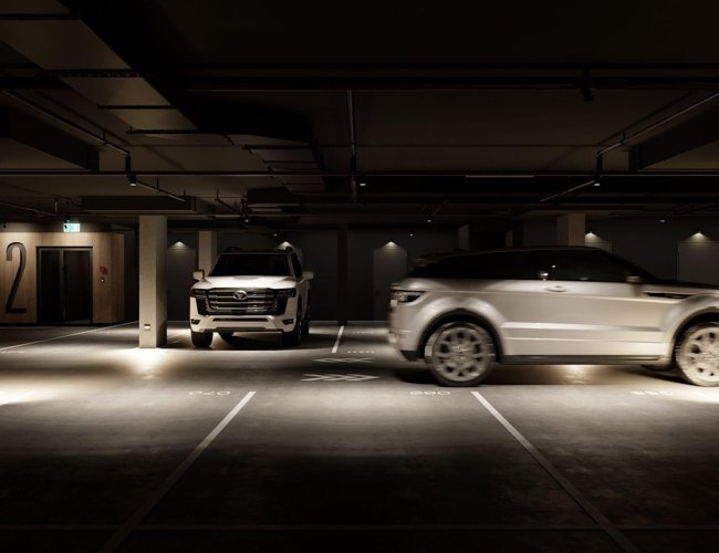 Двухуровневый паркинг оформлен как полноценная welcome-зона: аккуратный свет, выделенные входы, логичная навигация. Из паркинга можно подняться прямо на свой этаж, не попадая на улицу - это важная деталь в сибирских реалиях