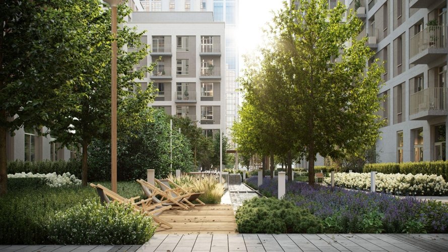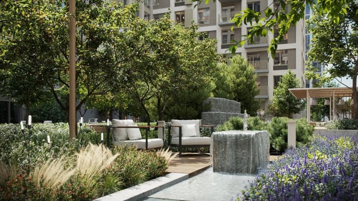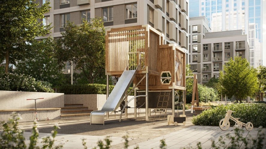 Ландшафт включает водную детскую площадку, ручьи, водопад, фонтан, спортивные зоны, места отдыха и рабочие пространства под навесами. Дворы тихие, зелёные, вдохновлённые идеей пэчворка: разные покрытия и растения создают ощущение цельного природного пространства