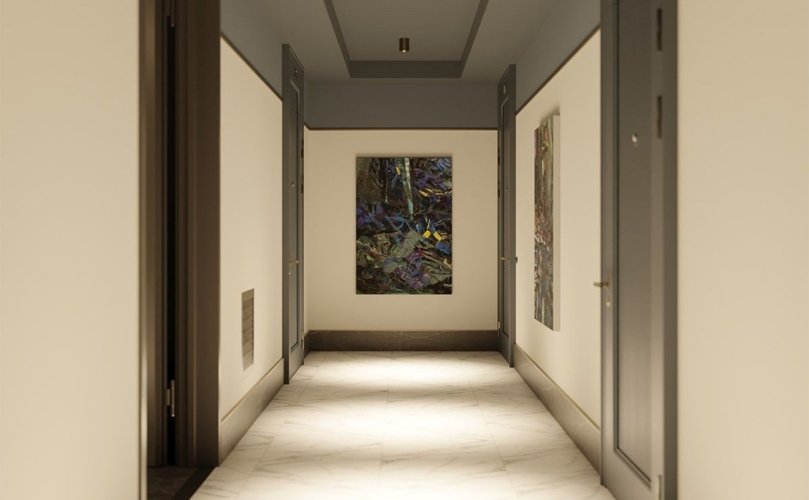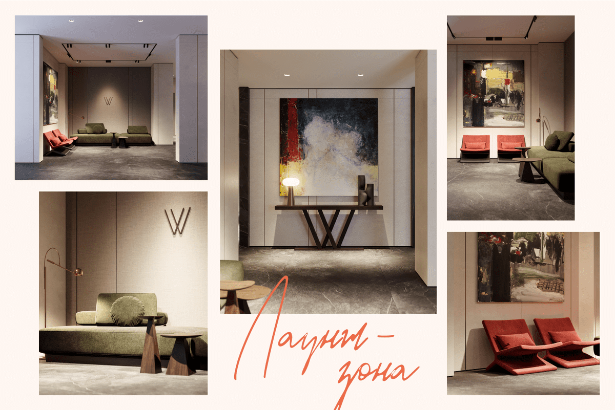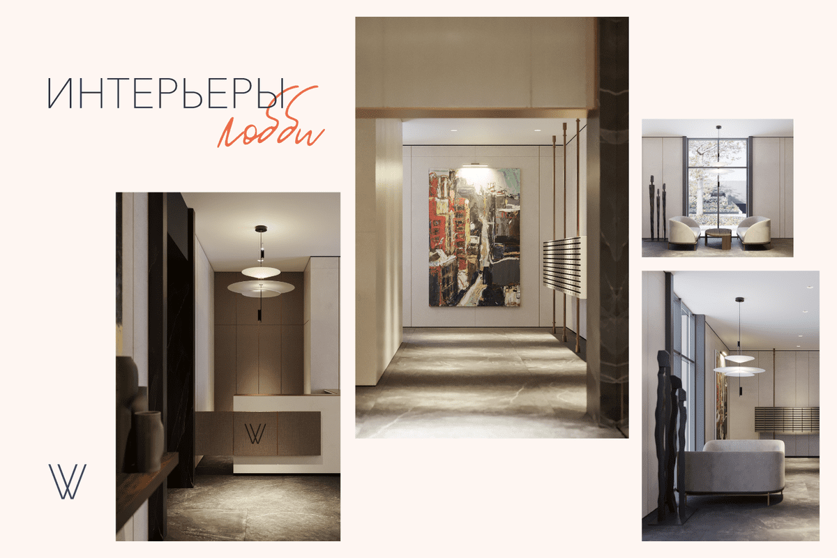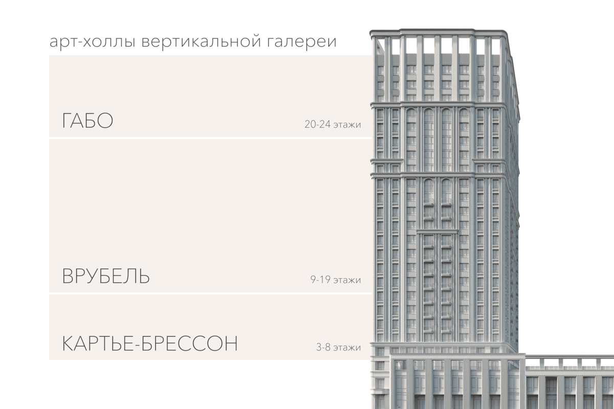 Интерьеры лобби оформлены как пространства современного искусства, а этажи разделены на три художественных направления: Картье-Брессон, Врубель и Габо. Декор, свет и материалы варьируются по этажности и создают уникальную среду дома