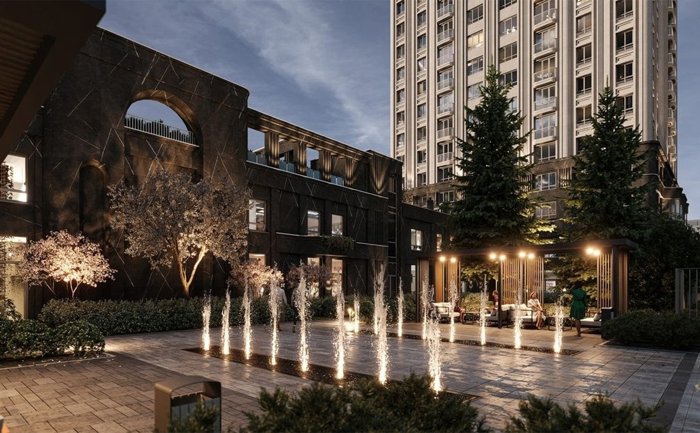 Внутренний двор скрыт от улицы и благоустроен по проекту архитектурного бюро: пешеходный фонтан, декоративные растения, подсветка и зоны для тихого отдыха создают атмосферу европейского двора