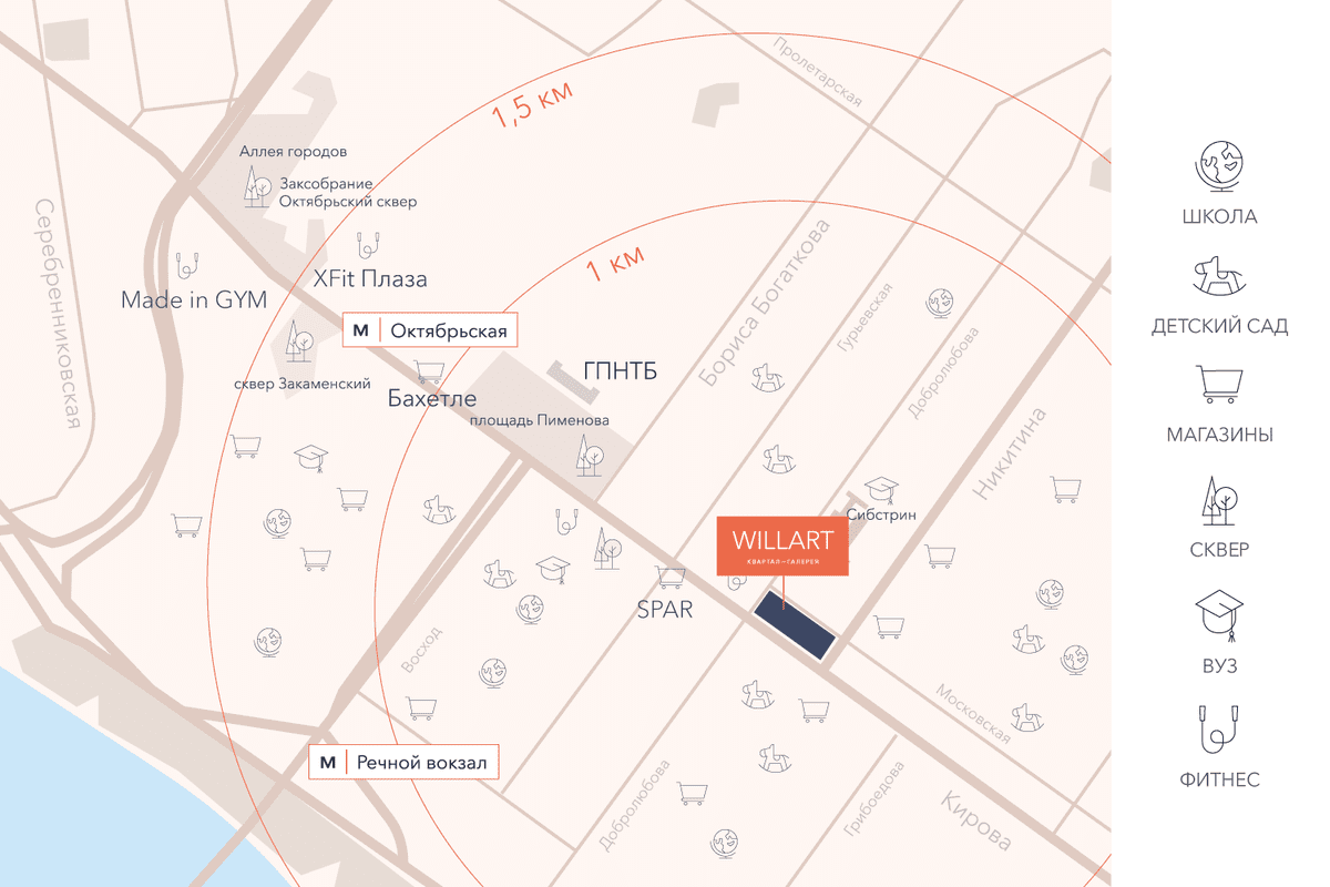 В WillArt делают ставку на комфорт, эстетику и продуманные решения, чтобы жильё было не просто квадратными метрами, а современной и удобной средой для жизни. Для жителей создан секретный сад на крыше галереи, закрытая внутренняя территория с зонами отдыха и детской площадкой и открытый бульвар со стороны Кирова. Квартал-галерея - место для ярких и творческих людей, которым важен не статус на словах, а атмосфера вокруг